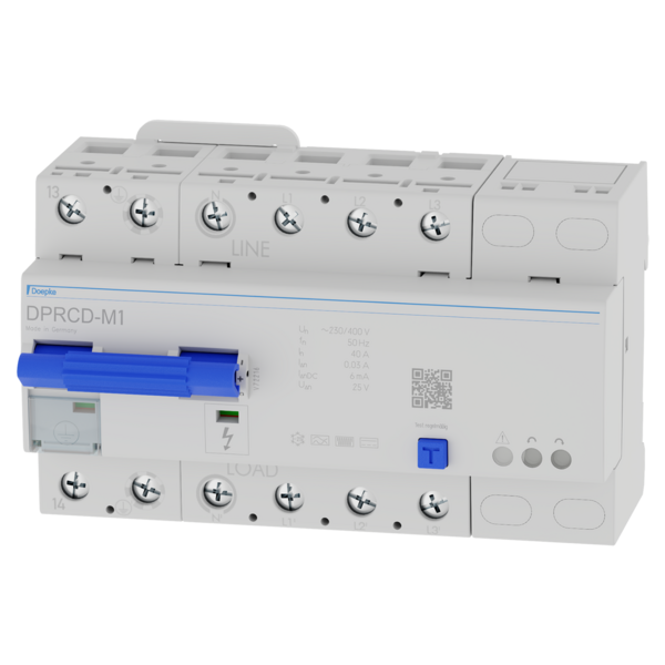 Devices in the DPRCD-M series are base components for producing three-phase PRCD personal protection devices. They are suitable for DIN rail mounting and are compatible with housings of leading manufacturers. The devices combine an AC-DC sensitive residual current device with network and protective conductor monitoring, and measure just 8 module widths. Thanks to 6-mA-DC detection, the device also ensures the protective function of upstream residual current circuit breakers.