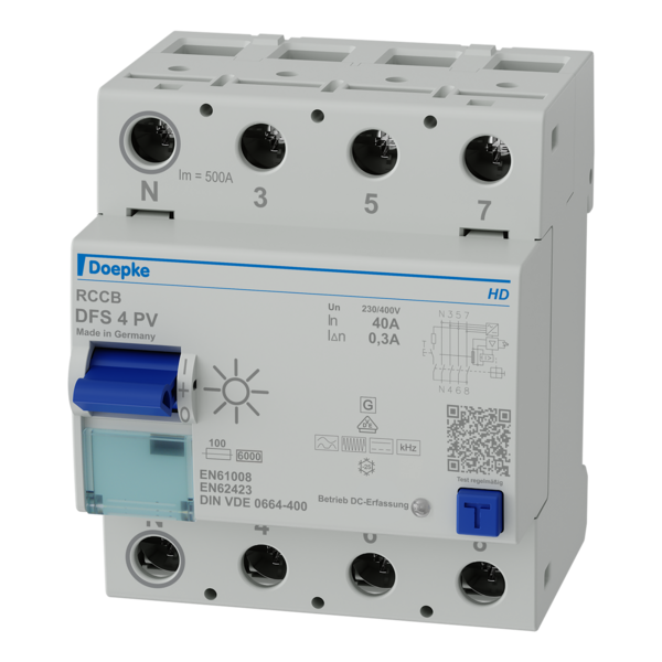 Residual current circuit-breaker specially designed for use in photovoltaic systems. Thanks to a PV-optimised short-time delay, the AC/DC sensitive residual current circuit-breaker is resistant to surge currents. It therefore offers higher system availability due to fewer false trips.